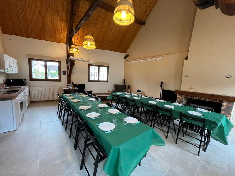 Mais aussi une cuisine dans le fond de la pièce avec si besoin des tables et des chaises pliantes qui permettront de recevoir jusqu´à 24 convives en cas de séminaire ou de réunion de famille/d´amis.